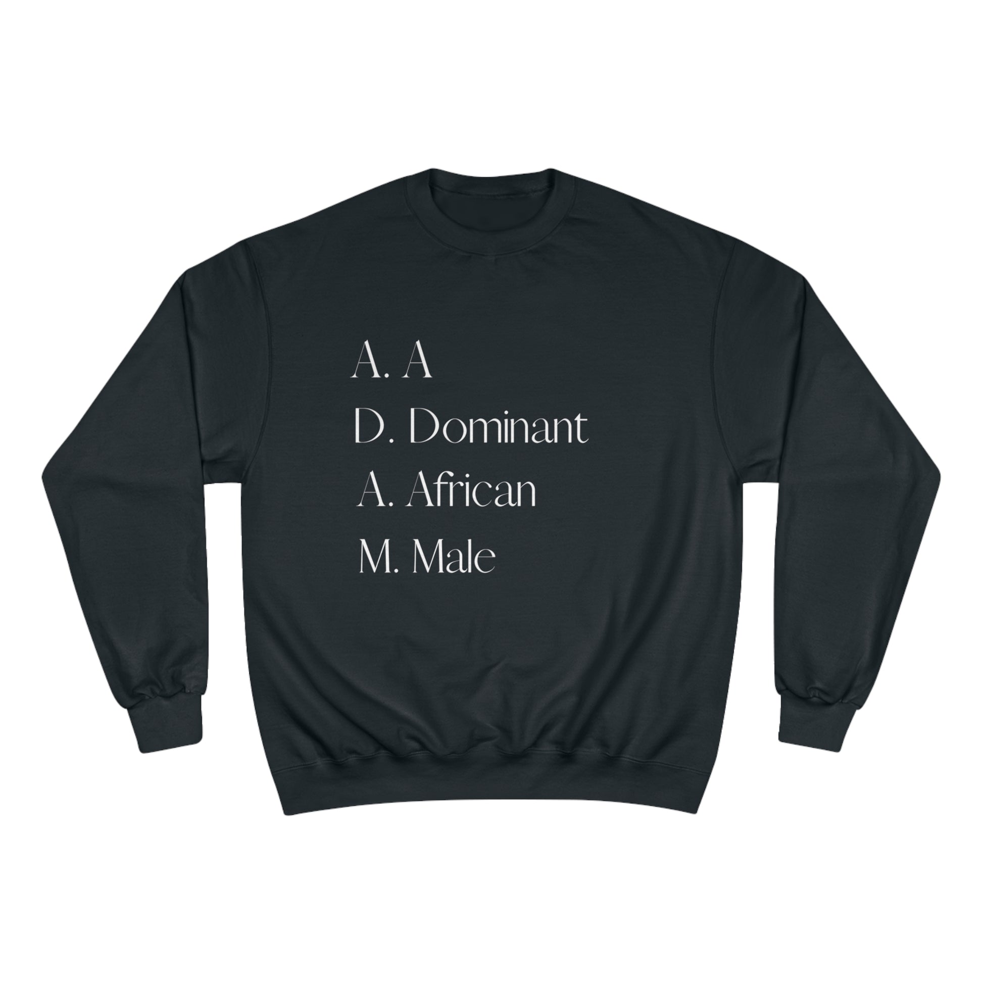 Neopolitan Drip presents A.D.A.M. A Dominant African Male. ND in collaboration with Champion for a winning product. The American heritage brand, Champion, brings you the eco crewneck sweatshirt. It features Double Dry® technology and is made of a cotton/polyester blend optimized for warmth and comfort. It has the iconic "C" logo on the left sleeve and is made of 5% recycled polyester from plastic bottles.