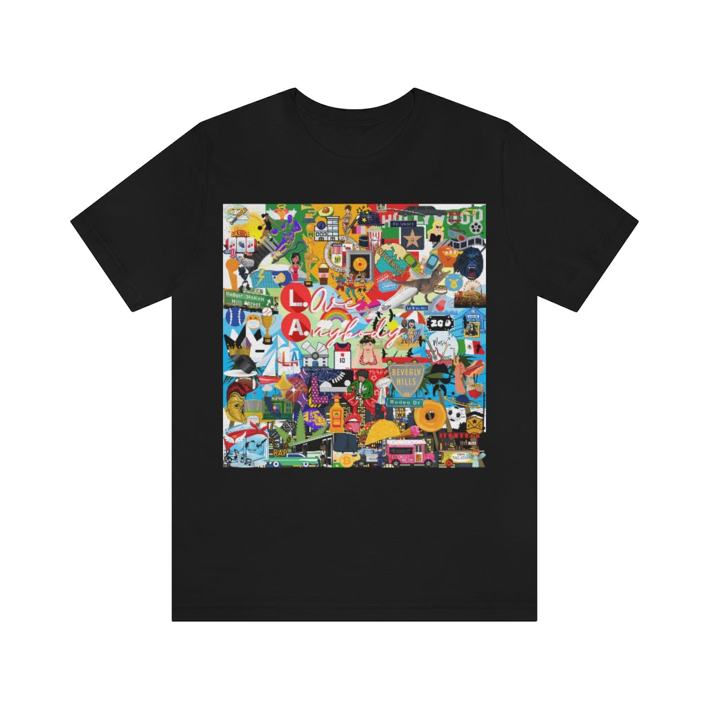 The ND City Series is a beautiful collection of sixteen American Cities. All abbreviated with acronyms for each, the series is done in a collage /mural form paying homage to each city and its make-up. L.A. is Love Anybody for the diversity of people who inhabit this beautiful city. Everything in "The City of Angeles" from beaches to celebrities. One of the world's top cities thats renowed for being tops in all facets of life. This classic unisex jersey short sleeve tee fits like a well-loved favorite. Soft cotton and quality print make users fall in love with it over and over again. These t-shirts have-ribbed knit collars to bolster shaping. The shoulders have taping for better fit over time. Dual side seams hold the garment's shape for longer.