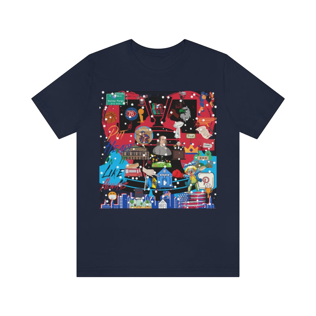 The ND City Series is a beautiful collection of sixteen American Cities. All abbreviated with acronyms for each, the series is done in a collage /mural form paying homage to each city and its make-up. Philadelphia is know for many things. Benjamin Franklin, The Liberty Bell , being the "City Of Brotherly Love". But also being know for always having heart! Put Heart In It LIke Always is what PHILA does! This classic unisex jersey short sleeve tee fits like a well-loved favorite. Soft cotton and quality print make users fall in love with it over and over again. These t-shirts have-ribbed knit collars to bolster shaping. The shoulders have taping for better fit over time. Dual side seams hold the garment's shape for longer.